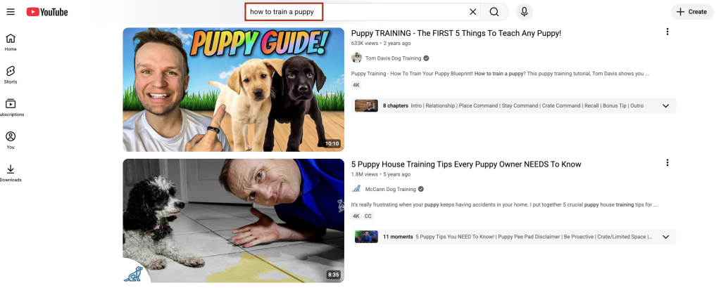 Start by typing your topic into YouTube search and open the top-performing videos. Pay close attention to their titles, descriptions, and content themes.