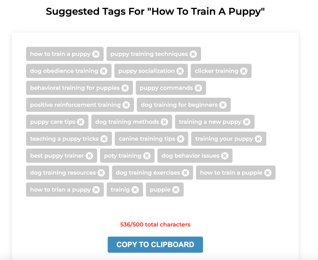 YouTube gives you up to 500 characters of tag space, which is enough to include your main keyword and a few related variations.